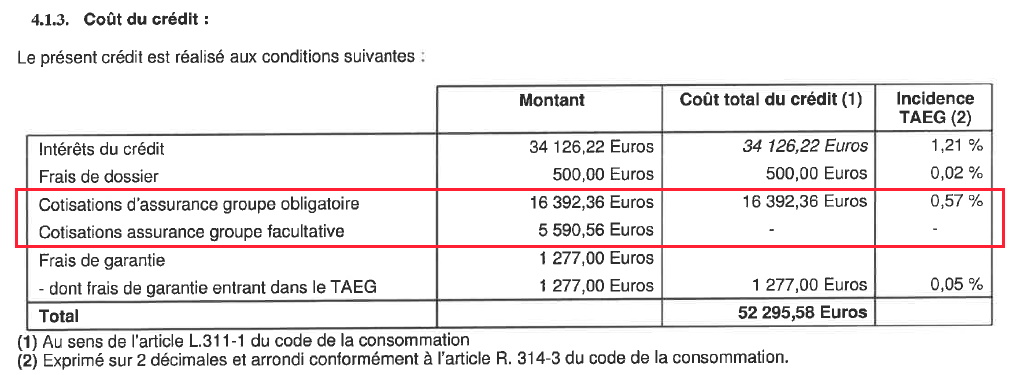 On observe sur le tableau récapitulant le coût du crédit, une ligne étrange, « cotisation d’assurance groupe facultative » pour 5590,56 €. Mais a priori, il n’y a pas de raison de s’en inquiéter, elle n’est reprise ni dans le coût du crédit ni dans le TAEG.
